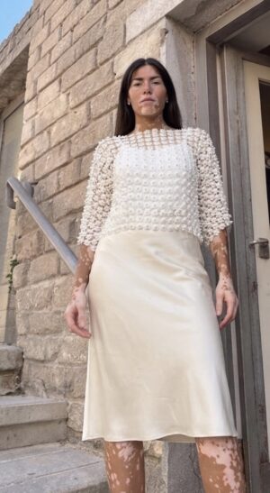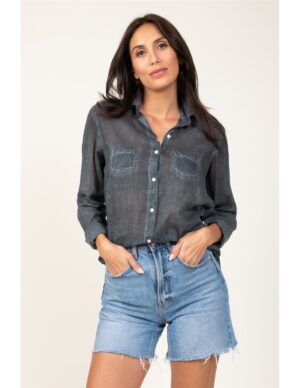 מכנסי כותנה של המותג PLEASE, שלושה כפתורים לסגירה, ארבעה כיסים.