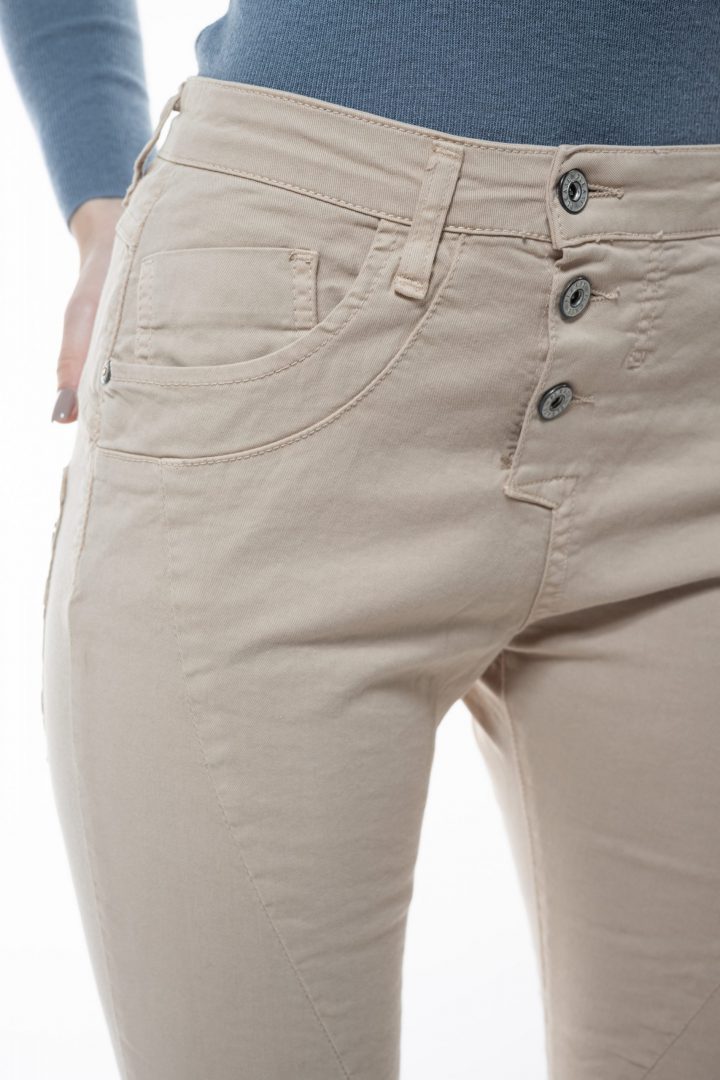 מכנסי כותנה של המותג PLEASE, שלושה כפתורים לסגירה, ארבעה כיסים.